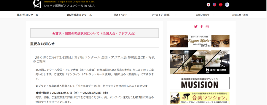 ショパン国際コンクール in ASIAは、ショパンの名を冠しているとおり、ショパンをはじめとしたポーランド人作曲家の楽曲が課題曲とされることが多いコンクールです。通称「ショパンアジア」。